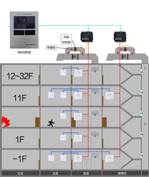 在消防行業(yè),一般是通過余壓探測(cè)器來時(shí)刻監(jiān)控樓梯間與前室之間的氣壓差,根據(jù)差值大小來控制風(fēng)機(jī)給樓梯間或前室的送風(fēng)量,使樓梯間的氣壓始終高出前室氣壓一定范圍內(nèi)。阻止煙霧擴(kuò)散,順利打開逃生門,且在逃生過程中遲可能不因過多煙霧吸入,保護(hù)人員安全;
