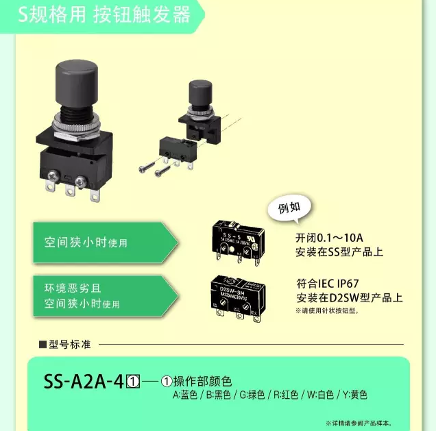 2、微動開關可通過自由組合方式設定按鈕,適用對象涵蓋從微小負載到密封構造的廣泛領域