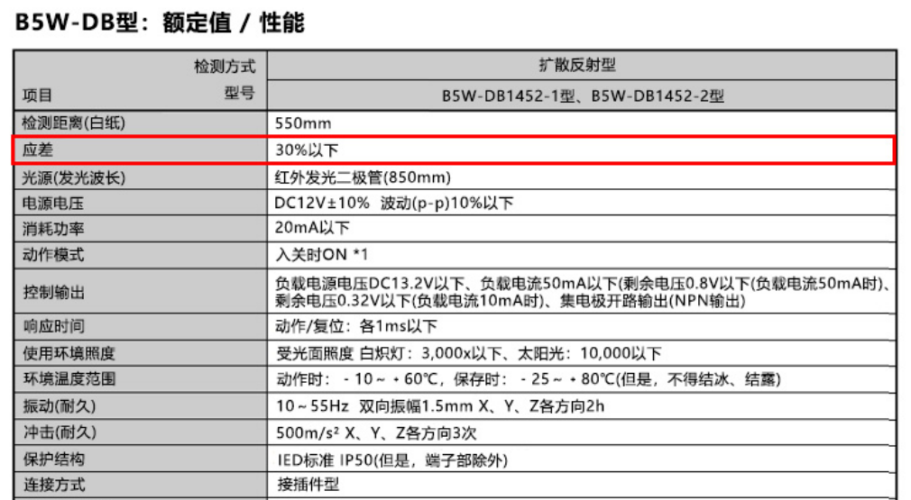 反射型光電傳感器上的動作距離是指使檢測物體接近傳感器時切換為ON的距離。此外,使檢測物體離開該范圍并切換為OFF的距離稱為復位距離。這個動作距離與復位距離之差稱為“應差距離”(參考見下圖)。如果無應差,則會在動作區(qū)域附近出現(xiàn)反復切換ON/OFF的現(xiàn)象(震顫)。為了防止這種現(xiàn)象的發(fā)生,需要設定應差。B5W-DB型的應差規(guī)定在30%以下。例如,某單體以800mm的距離切換為ON時,表示復位距離為800 mm X 1.3 =1,040 mm以下。