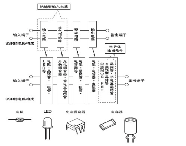 所謂SSR,是固態(tài)繼電器(Solid State Relay) 的簡稱,是無可動接點部分的繼電器(無接點繼電器)。在動作上與有接點繼電器相同,但是該繼電器使用半導體閘流管、晶閘管開關元件、二極管、晶體管等半導體開關元件。另外也使用名為光電耦合器的光半導體, 使其輸入輸出絕緣。光電耦合器的特點是用光的信號在絕緣空間中進行傳送,所以絕緣性更好, 傳送速度也更快。