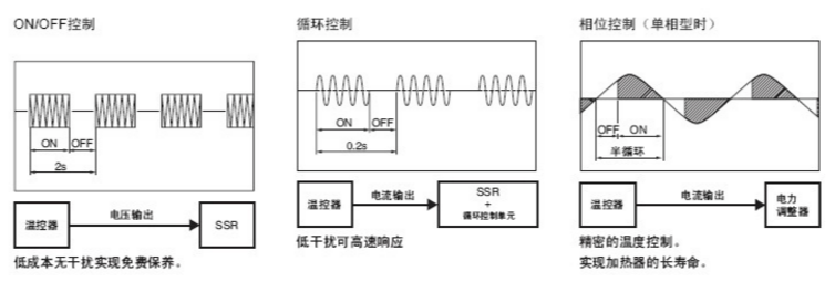 控制、循環(huán)控制、 相位控制) ON/OFF控制接受溫控器的電壓輸出信 號, 通過開關SSR來控制加熱器的 ON/OFF。在電磁繼電器中也可進行相同 的控制, 但是以數秒間隔控制ON/OFF, 使用數年時需要SSR。 循環(huán)控制(G32A-EA) 以0.2秒(固定) 為 控制周期。其方式是使其在0.2秒內 ON/OFF, 從而控制輸出電力。 接受溫控器的電流輸出4~20mA來控制。