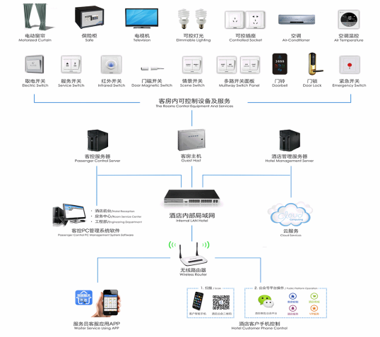 客房智能控制主機、客房控制面板和客房管理軟件三部分組成客房智能控制系統(tǒng),并可以根據(jù)客戶需求自由組合和擴展模塊。通過弱電控制強電的方式,實現(xiàn)對照明、排氣扇、空調、窗簾、音視頻及服務信息等功能控制。采用TCP/IP協(xié)議或CAN-BUS總線組網(wǎng),能夠實現(xiàn)遠程管理與控制,還可以與蘋果(IOS)、安卓(Android)系統(tǒng)的移動終端設備無縫連接,可由移動終端設備進行控制,為客房營造典雅、溫馨、舒適的環(huán)境,實現(xiàn)酒店的智能控制、綠色環(huán)保和高效管理。
