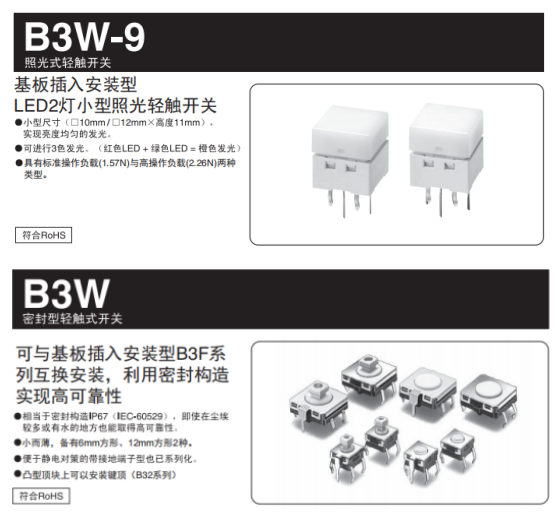 首先來聊聊什么商用飲水機上可以用我們歐姆龍的哪些產(chǎn)品,這里小編給大家推薦可以應(yīng)用在飲水機上面歐姆龍的輕觸開關(guān),B3W防水系列和B3W-9帶燈的系列,都可應(yīng)用。