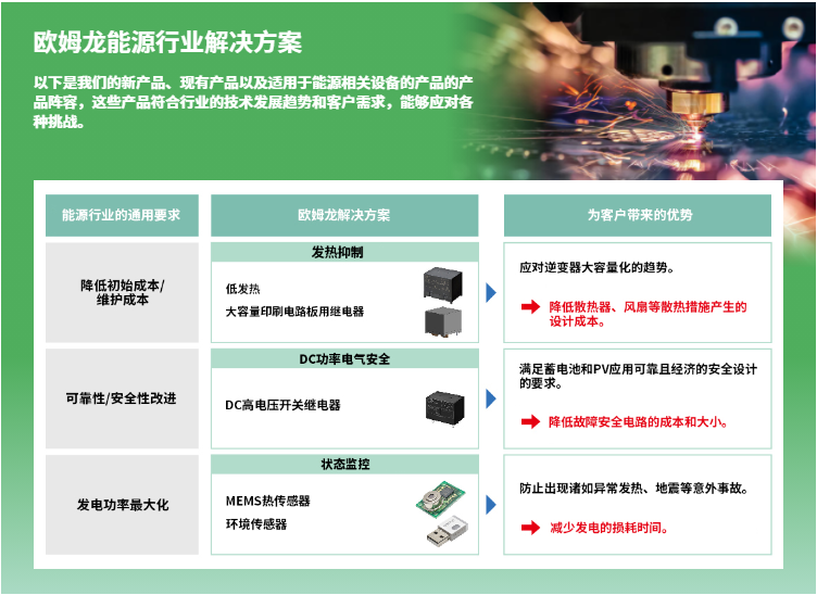 在能源行業(yè)新產(chǎn)品,除上期介紹的G9KA、G7EB、G9KB、G7L-X、G2RG-X、G5PZ-X等6個(gè)系列功率繼電器,還有以下產(chǎn)品方案: