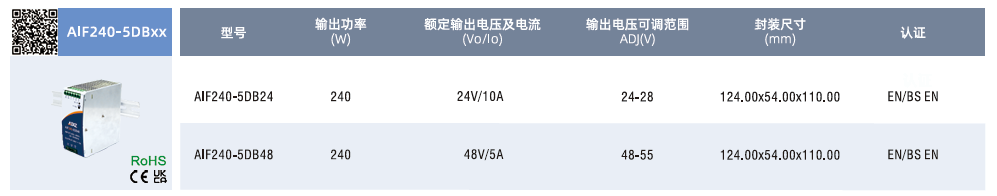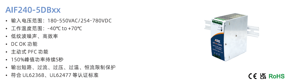 導軌式電源兩相金屬導軌AIF240-5DBxX ?輸入電壓范圍:180-550VAC/254-780VDC ?工作溫度范圍:-40°Cto+70°C ?低紋波噪聲、高效率 ?DCOK功能 ?主動式 PFC功能 ?150%峰值功率持續5秒 ?輸出短路、過流、過壓、過溫、恒流限制保護 ?符合 UL62368、UL62477 等認證標準