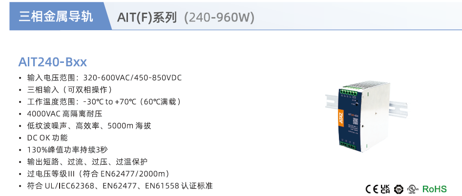 AIT240-Bxx 。輸入電壓范圍:320-600VAC/450-850VDC 三相輸入(可雙相操作) 工作溫度范圍:-30℃℃to +70℃(60℃滿載) 4000VAC高隔離耐壓 低紋波噪聲、高效率、5000m 海拔 中 ·DCOK功能 130%峰值功率持續3秒 輸出短路、過流、過壓、過溫保護 過電壓等級川(符合 EN62477/2000m) ·符合 UL/IEC62368、EN62477、EN61558認證標準