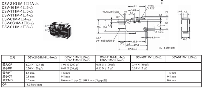 | 針狀按鈕型 | --- | 1.96N {200gf} | D3V-16-1□5-△ | D3V-16-2□5-△ | D3V-16-3□5-△ |