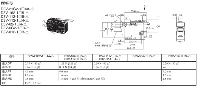 | 長擺桿型 | 內部安裝 | 0.69N {70gf} | D3V-163-1□5-△ | D3V-163-2□5-△ | D3V-163-3□5-△ |