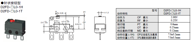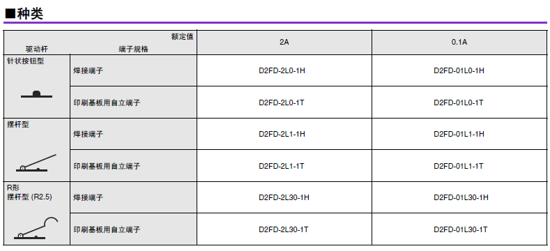 D2FD-2 超級(jí)小型基本開關(guān) 兼具防塵功能的極超小型基本開關(guān) 利用橡膠封裝的密封結(jié)構(gòu)實(shí)現(xiàn)防塵 (IEC IP6X)。可在有灰塵、紙粉的環(huán)境下使用。 可動(dòng)片為1片彈簧構(gòu)造,支持AC125V 2A開關(guān),更有微小負(fù)載型可供選擇。 還備有焊接、印刷基板用端子。