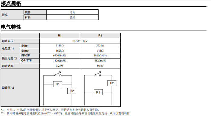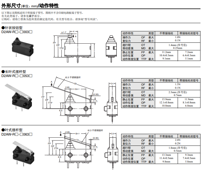 內置電阻,可檢測4種狀態 長行程密封型開關 開關 ON/OFF/短路/斷線 輸出4種狀態 即使無擺桿也便于使用的長行程規格 (OT參考值:1.4mm) 憑借滑動接點結構實現高接觸可靠性和安靜的動作音